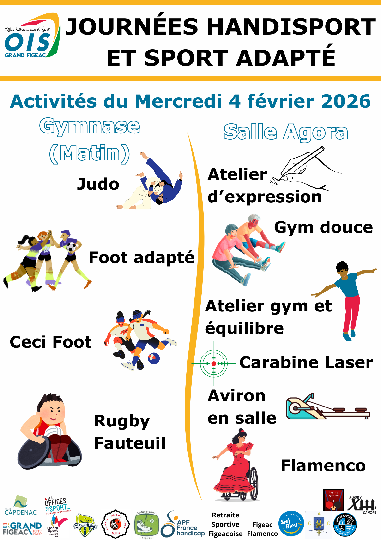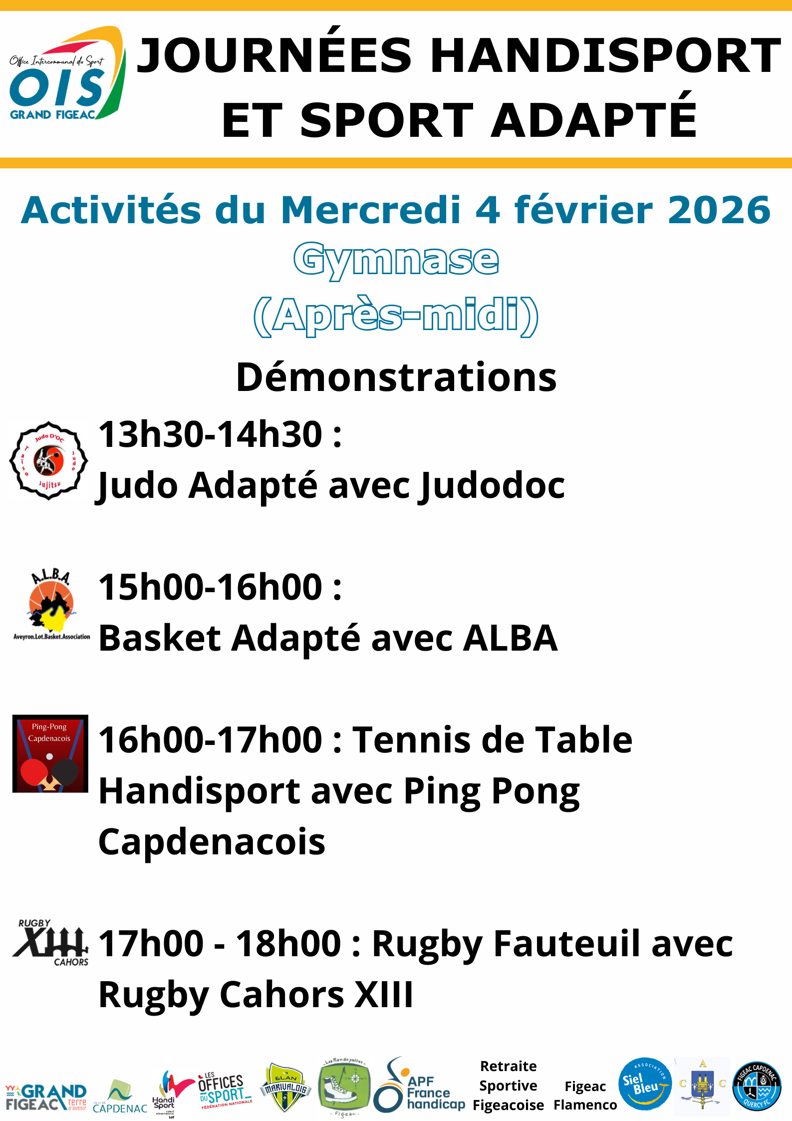Des ateliers à thèmes pour faire découvrir le handisport et le sport adapté aux enfants, adultes, en situation de handicap ou valides sont animés chaque année par l’O.I.S Grand-Figeac et ses partenaires ainsi que les associations locales qui œuvrent dans le handicap moteur ou psychique.