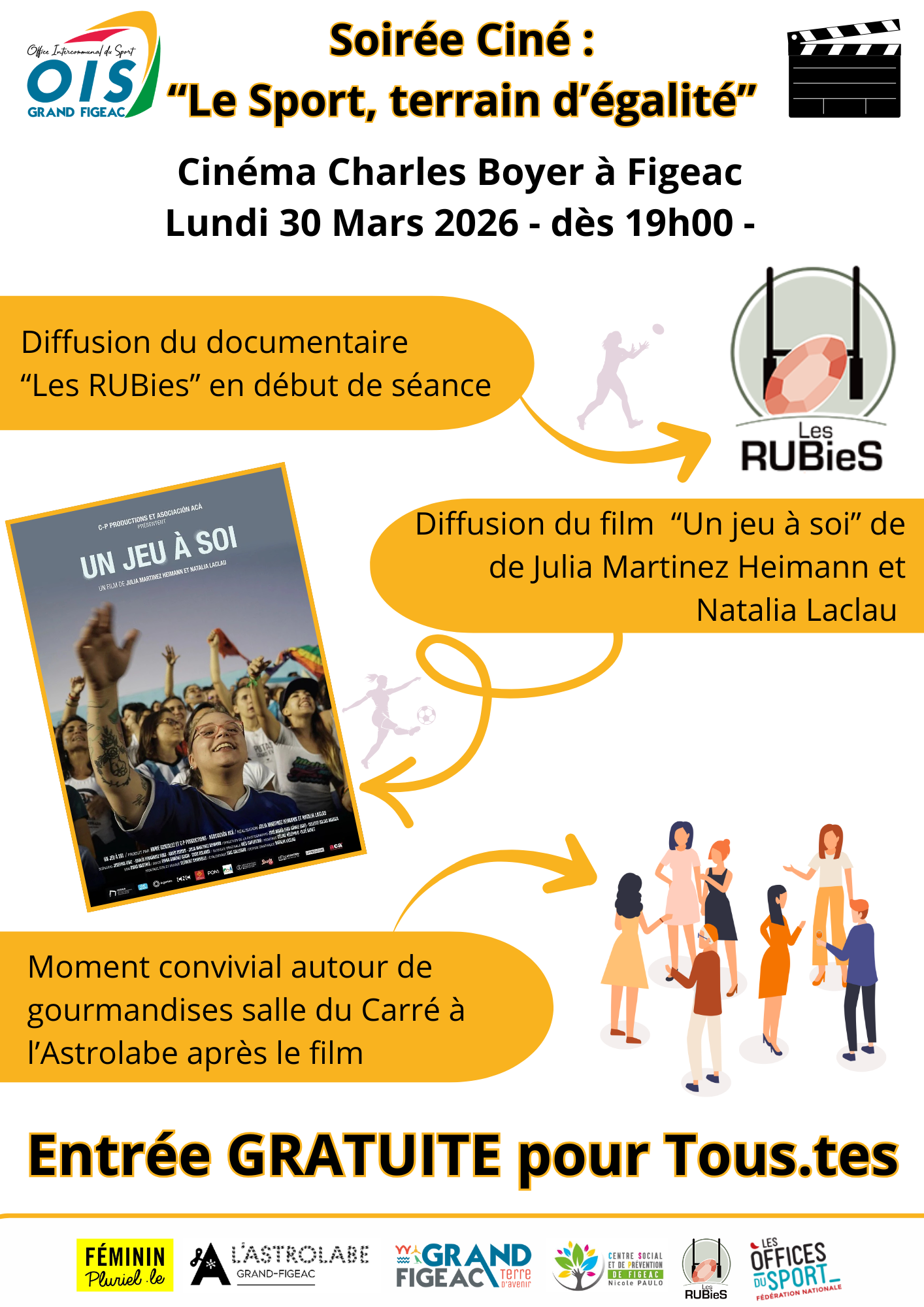 Le 30 mars 2026 à 19h00, l’OIS Grand-Figeac a organisé, en partenariat avec l’Astrolabe, une soirée projection avec la diffusion du court métrage “Les Rubies” et du film “Un jeu à soi” au cinéma Charles Boyer de Figeac dans le cadre de l’évènement Féminin Pluriel.le.